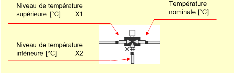 - Température nominale variable : La vanne mélangeuse est réglée sur la base des températures d’entrée mesurées de telle sorte que la température spécifiée « Valeur variable » soit atteinte à la sortie de la vanne mélangeuse, en tenant compte de la variation de température.