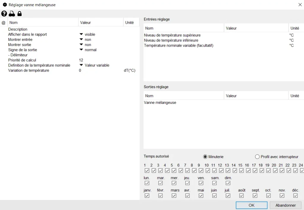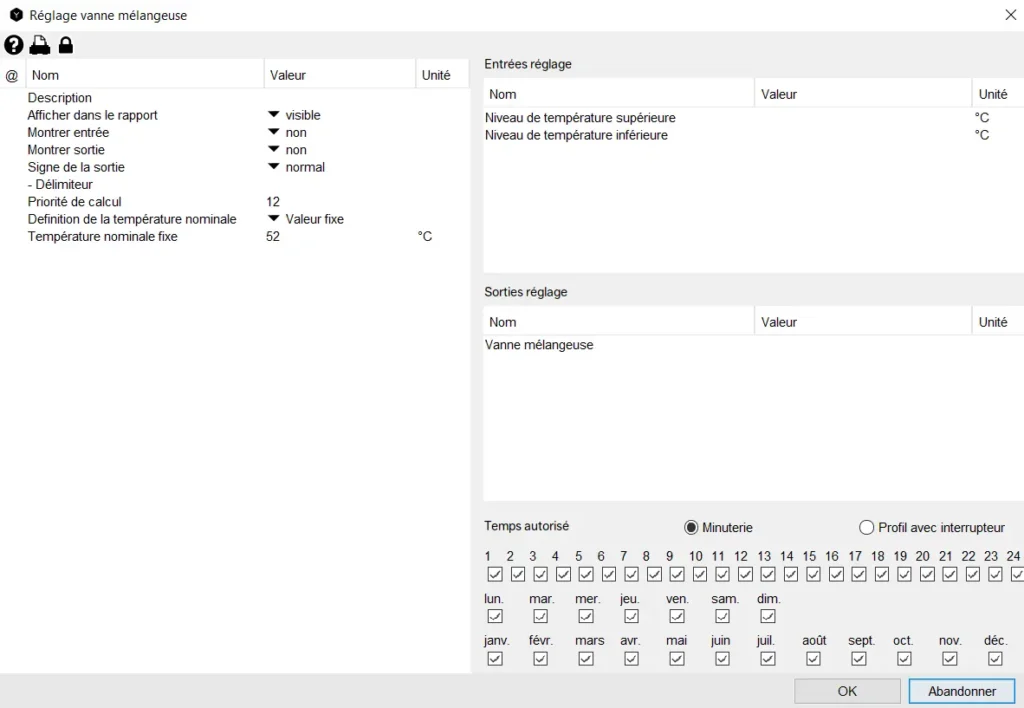 | Y1: État vanne mélangeuse | Température nominale variable | Régler la vanne mélangeuse sur – Valeur contrôlée | X1: Niveau de température supérieure [°C] | Y1=f(X1,X2,X3) pour la valeur mesurée spécifiée de la température nominale variable plus la variation de température |