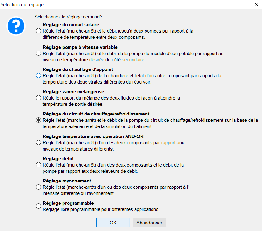 En insérant un réglage (version du concepteur) dans la variante, il vous sera demandé de déterminer le type de réglage :
