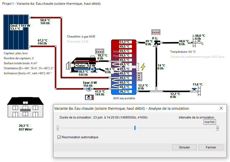 L’analyse de la simulation vous permet de voir chaque paramètre principal de tous les composants du système et chaque intervalle calculé sur toute l’année. Les résultats les plus importants sont affichés pour chaque composant du système (par exemple, réservoir – température dans chaque strate, le champ de capteurs solaires – rendement du champ de capteurs et température moyenne de l’eau sortante). Si vous cliquez sur les boutons « + » ou « – » ou si vous appuyez sur les touches fléchées gauche ou droite de votre clavier, vous pouvez afficher les intervalles. D’un simple clic ou d’une frappe au clavier, vous avancez ou reculez d’un intervalle. Si vous maintenez la touche Ctrl de votre clavier enfoncée, vous sautez dix intervalles en avant ou en arrière. Si vous maintenez la touche Shift enfoncée, vous avancez ou reculez de 100 intervalles. Vous pouvez également utiliser le « curseur » pour déterminer librement l’intervalle affiché. Pour ce faire, cliquez sur le cercle et maintenez le bouton de la souris enfoncé tout en faisant glisser le cercle vers la gauche ou la droite.