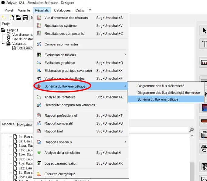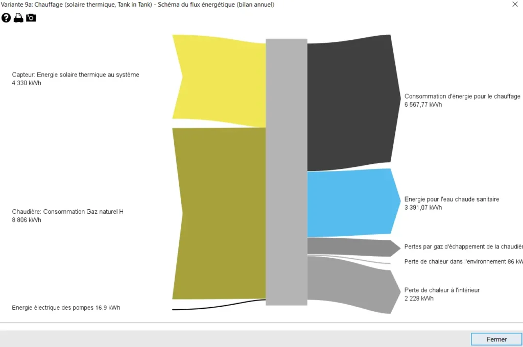 Le diagramme de flux énergétique vous montre graphiquement le bilan énergétique du système que vous avez conçu. Vous pouvez y accéder de deux manières : soit par le biais de l’élément de menu « Résultats », soit en appuyant sur la combinaison de touches Ctrl+Shift+E.