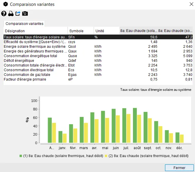 Pour l’évaluation technique et la comparaison des performances des différents systèmes du projet, l’utilisateur peut sélectionner l’élément de menu « Comparaison variantes » dans le menu déroulant Résultats. Cette fonction permet à l’utilisateur de voir comment un changement dans la conception du système modifie les performances de ce dernier. En outre, il peut être utilisé pour examiner rapidement le comportement du système dans différentes conceptions. Vous trouverez ci-dessous un exemple de comparaison variantes :