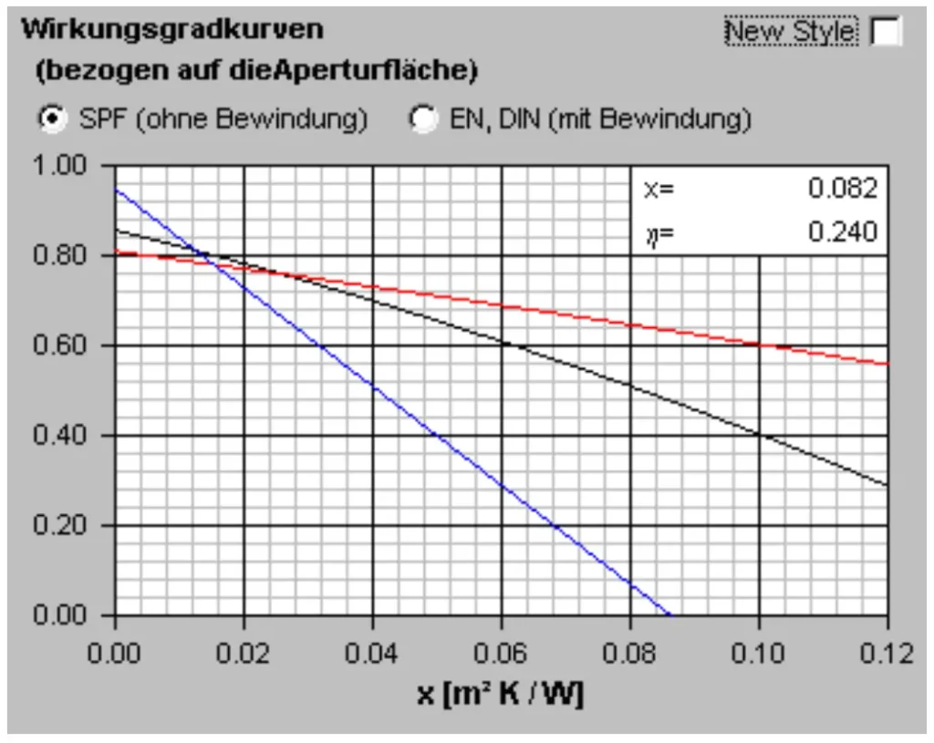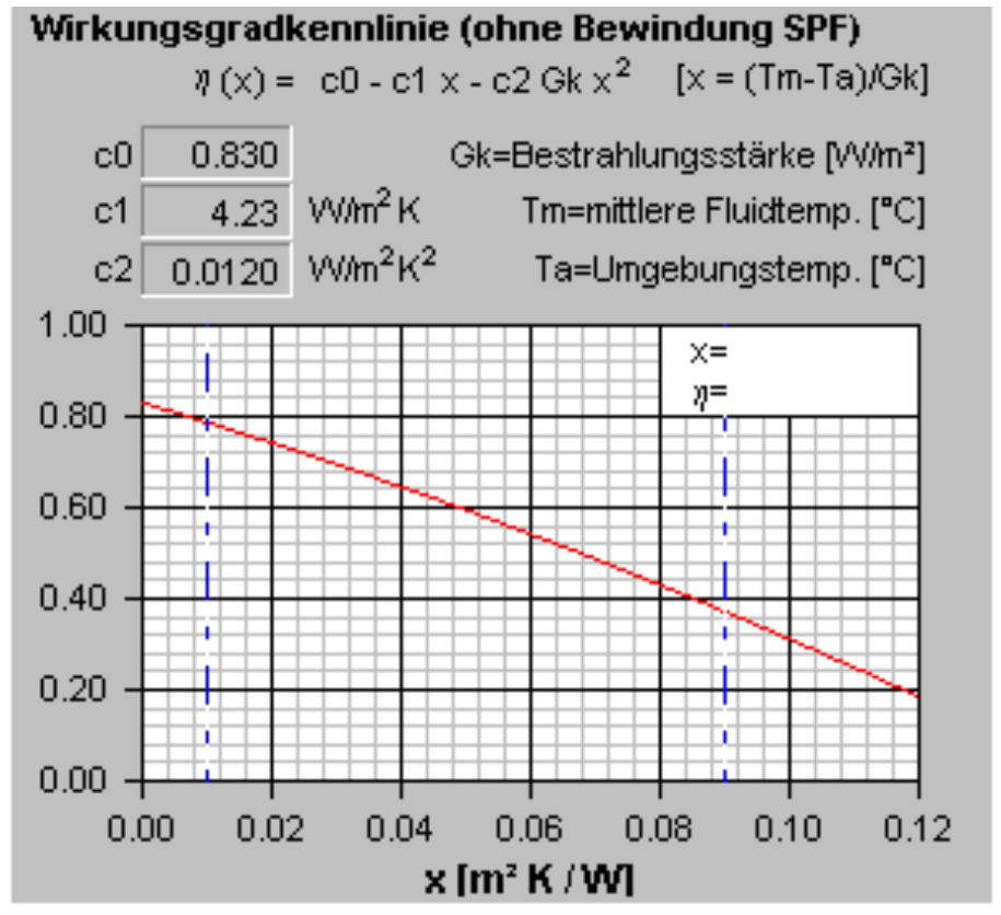 Selon la nouvelle norme de mesure (EN 12975), les capteurs non couverts disposent d’un paramètre supplémentaire. La courbe de fonction de l’efficacité se présente sous la forme suivante :