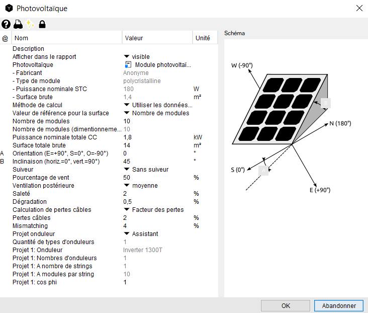Le dialogue suivant est disponible dans Polysun pour sélectionner l’orientation :