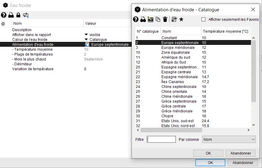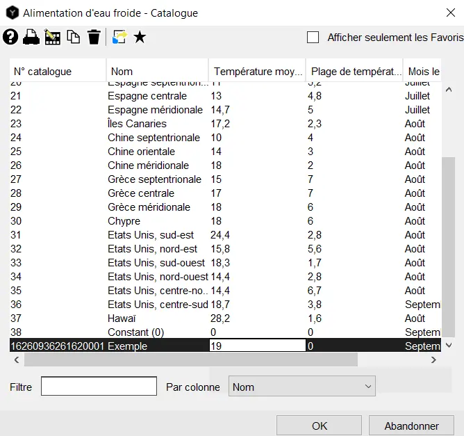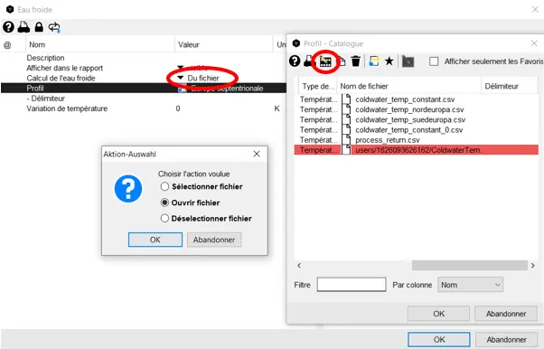 L’option « Catalogue » vous permet de sélectionner un profil d’alimentation d’eau froide dans un catalogue. Pour ce faire, double-cliquez sur le symbole du fichier.