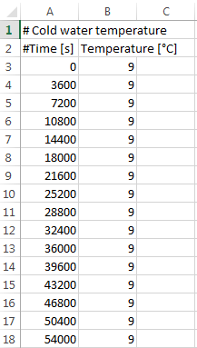 Le fichier Excel au format .csv contient les températures d’afflux d’eau froide par pas de 60 minutes. Les valeurs contenues dans le fichier peuvent être écrasées, puis le fichier est enregistré sous un nouveau nom.