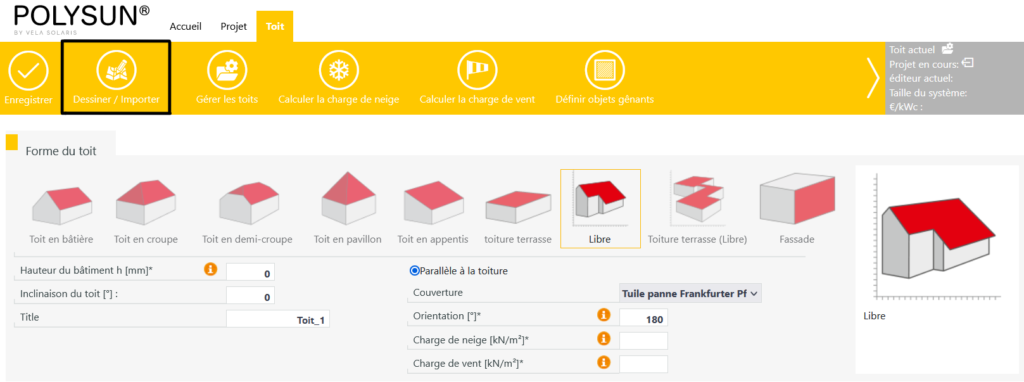 Si vous avez sélectionné une forme de toit de type « libre », la possibilité « Dessiner / Importer » y apparaît.