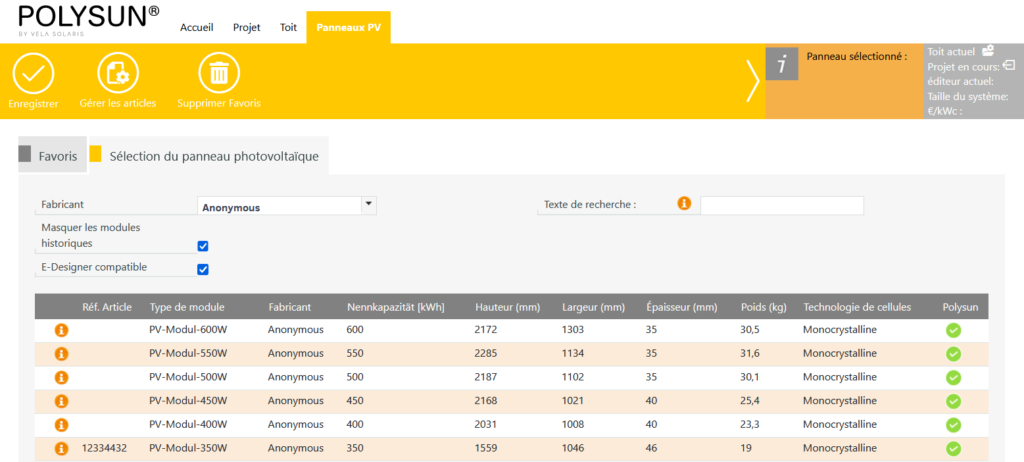 Dans le catalogue de panneaux PV, vous avez la possibilité de faire votre choix dans une grande base de données.