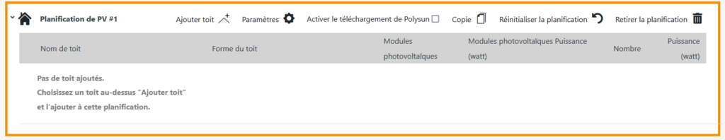 Vous pouvez maintenant ajouter des surfaces de toit à cette planification afin d’ajouter les modules PV placés à la planification. Pour ce faire, cliquez sur « Ajouter toit » et sélectionnez « Ajouter tous les toits ».