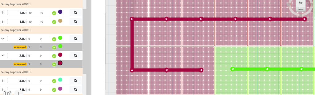 Dans l’onglet Électricité, vous avez la possibilité d’effectuer l’enchevêtrement manuellement ou automatiquement. Pour effectuer l’enchevêtrement automatiquement, cliquez sur « Horizontal » ou « Vertical ». Selon votre choix, les modules seront reliés entre eux soit horizontalement, soit verticalement. Effectuez cette étape pour chaque surface de toit. Pour passer à une autre surface de toit, double-cliquez sur celle-ci.