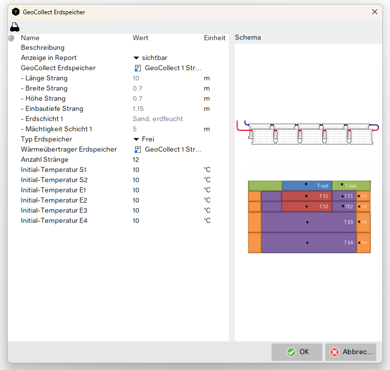 Die ersten sechs Parameter definieren die Geometrie der GeoCollect Erdspeicherkomponente. Die Verteilung WT S1 \(S_{t1} \) steht für die Verteilung des Wärmetauschers in den Erdschichten \(S_1\) und \(S_2\). Ein Wert von \(S_{t1} \) = 0.4 bedeutet, dass 40% der Oberfläche des Wärmetauscher in der Schicht $ latex S_1} installiert sind, während 60% in der Schicht \(S_2\) installiert sind.