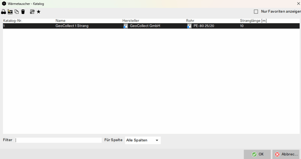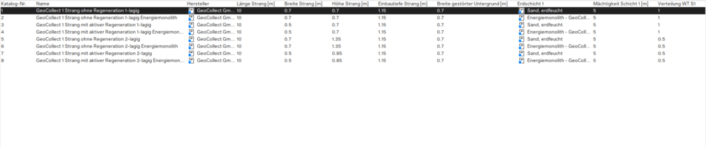 Die Parameter des Erdspeicher-Wärmetauscherkatalogs sind hier gezeigt.