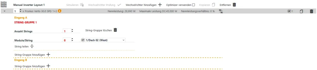 Pro MPP-Tracker wird in Polysun SPT ein separater Eingang angezeigt (Eingang A und B in der Abbildung). Wenn Sie Ihrer Planung mehrere Dächer mit gleichen Modulen hinzugefügt haben, erscheint zusätzlich die Möglichkeit, weitere Stringgruppen pro Eingang anzulegen.