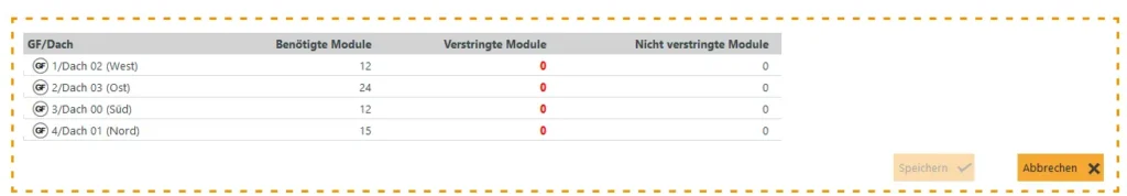 Am Ende der Auswahl sehen Sie eine Auflistung der Dächer. Hier ist übersichtlich dargestellt, wie viele Module pro Dach noch verstringt werden müssen. Wenn alle Module verstringt sind, kann die manuelle Wechselrichterauswahl gespeichert werden.